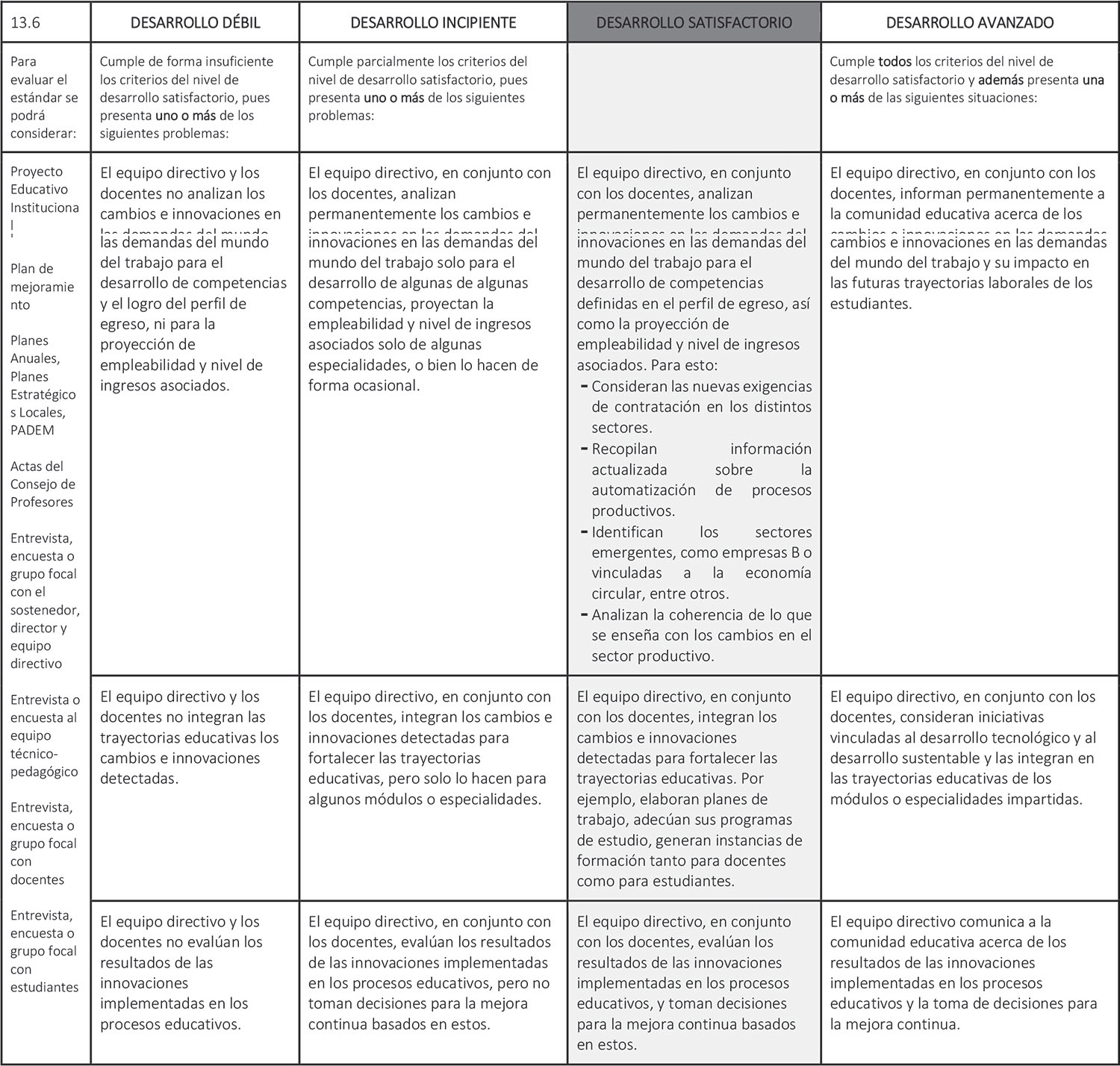 Estándar 13.6: El equipo directivo y los docentes analizan los cambios e innovaciones en las demandas del mundo del trabajo para fortalecer las trayectorias de los estudiantes.