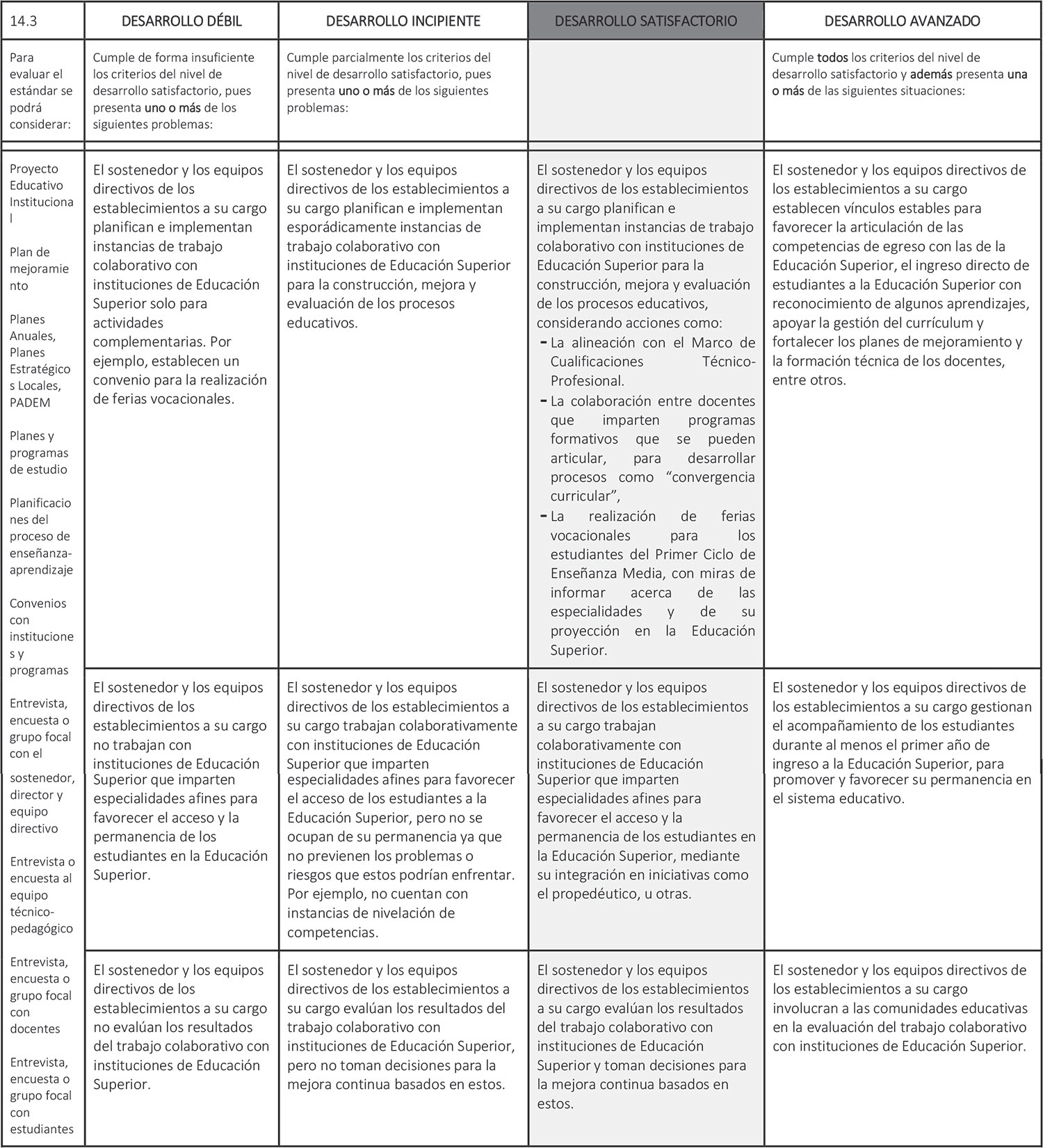 Estándar 14.3: El sostenedor y los equipos directivos de los establecimientos a su cargo trabajan colaborativamente con instituciones de Educación Superior que imparten carreras técnico-profesionales afines.