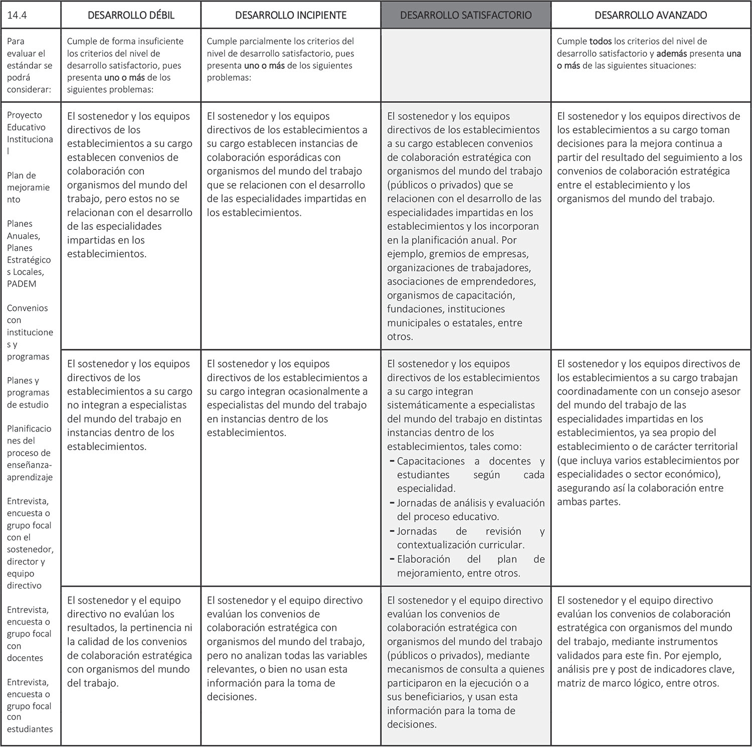 Estándar 14.4: El sostenedor y los equipos directivos de los establecimientos a su cargo establecen mecanismos de colaboración estratégica con distintos organismos del mundo del trabajo relacionados con las especialidades que se imparten.