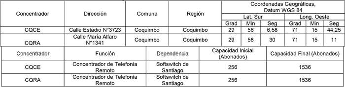 Los abonados asociados a la zona de servicio antes señalada dependerán de los Concentradores de Telefonía Remoto en Coquimbo.