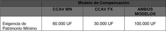 8. El Operador de Cámara deberá constituirse con un capital pagado no inferior al monto mínimo que se establece, y mantener permanentemente dicha suma en la condición de exigencia de un patrimonio mínimo, cuya graduación dependerá de el o los modelos de compensación que gestione el Operador, de acuerdo a la tabla siguiente: