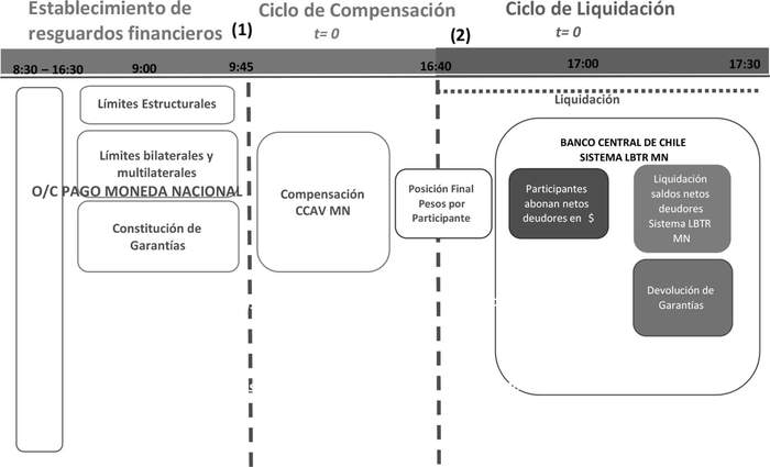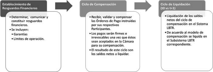 17. La operación de las Cámaras estará organizada en Ciclos de Operación, los que se componen de tres etapas consecutivas, (i) Establecimiento de resguardos financieros; (ii) Ciclo de Compensación y (iii) Ciclo de Liquidación. A continuación, se resumen los principales aspectos para cada etapa: