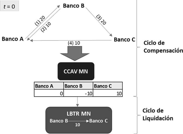 3 Posteriormente, comienza el Ciclo de Compensación en moneda nacional durante el cual los Participantes podrán presentar órdenes de pago mutuamente en moneda nacional. Al final de este ciclo, cada Participante tendrá un saldo neto deudor o acreedor con el resto de los Participantes. El diagrama 1, en su parte superior, ejemplifica un ciclo de compensación entre tres bancos y muestra el resultado neto para cada uno de ellos, el que será liquidado en el Sistema LBTR MN.