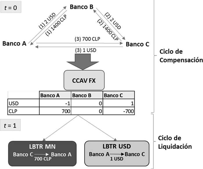 3 Posteriormente, comienza el Ciclo de Compensación durante el cual los Participantes que hubieren dado cumplimiento a los resguardos financieros aplicables, podrán presentar órdenes de pago para su compensación en moneda nacional y en dólares. Al final de este ciclo, cada Participante tendrá un saldo neto deudor o acreedor en moneda nacional y un saldo neto en sentido inverso en dólares, respectivamente, con el resto de los Participantes. El diagrama 1, en su parte superior, ejemplifica un ciclo de compensación entre tres bancos y muestra el resultado neto para cada uno de ellos, en ambas monedas, el que será liquidado en el Sistema LBTR MN y LBTR USD de acuerdo a la moneda correspondiente.