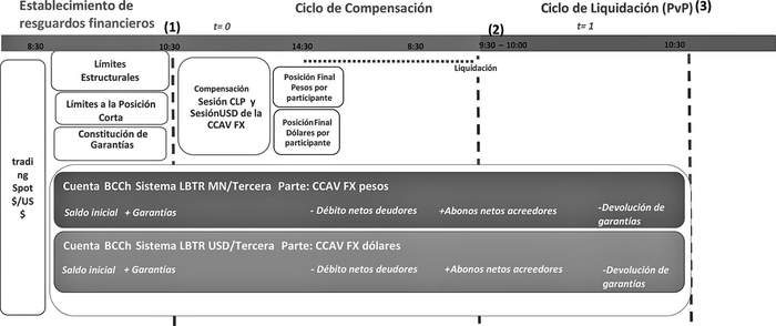 2 En el Ciclo de Operación de la CCAV FX, en primer lugar, el Operador deberá establecer los resguardos financieros que los Participantes deben cumplir, comunicándolo a éstos y al Banco Central de Chile (BCCh). En este caso, los resguardos deben consistir al menos en el cumplimiento de Límites Estructurales, el cálculo y determinación de Límites a la Posición Corta en moneda nacional y dólares, y garantías colectivas e individuales, de acuerdo a lo establecido en el Título VII del Capítulo III.H.5 de este Compendio.