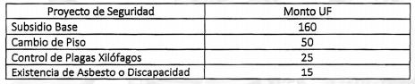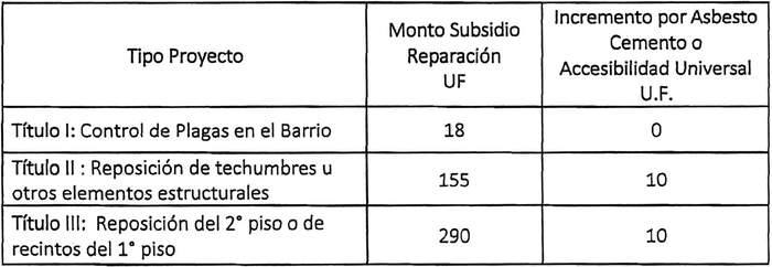 10) Se podrá otorgar un monto mayor de subsidio respecto a lo señalado en el artículo 6, del DS N° 255 (V. y U.), 2006, dada la necesidad de financiar las reparaciones más complejas que se pueden dar en estos casos. Este mayor monto de subsidio para la intervención de la vivienda podrá incrementarse si la cubierta está constituida por asbesto cemento y deba ser reemplazado, como también si existen personas con discapacidad. Los montos de subsidios para este llamado serán los indicados según lo señalado en la siguiente tabla: