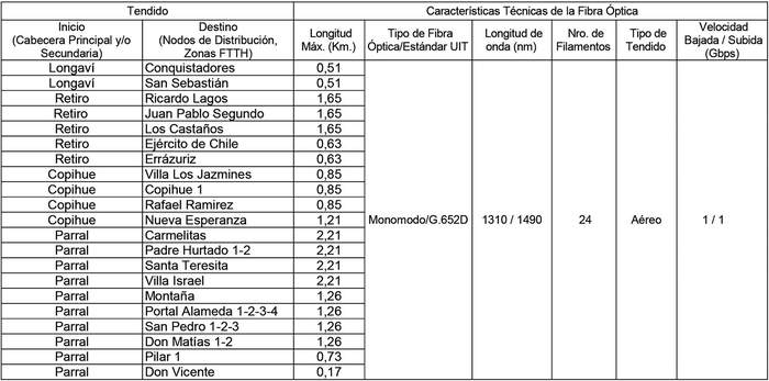1.3 Enlaces de Fibra Óptica desde Cabecera Principal y/o Secundaria a Nodos de Distribución (Zonas FTTH), según se indica a continuación: