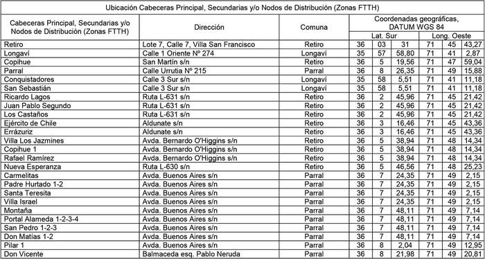 1.1 Un (1) Nodo Emisor (Cabecera Principal) en la comuna de Retiro y nodos secundarios en las comunas de Longaví y Parral y en la localidad de Copihue, todas de la Región del Maule.