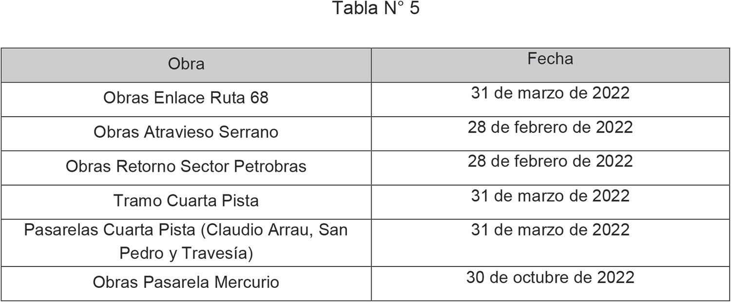 Se deja constancia que, mediante Oficio Ord. N° 8627/16, de fecha 2 de agosto de 2016, el Inspector Fiscal notificó a la Sociedad Concesionaria la total tramitación de la Resolución DGOP (Exenta) N° 2584, de fecha 22 de julio de 2016, y que el término de los trabajos de demolición materia del presente Nº 1 se verificó con fecha 31 de agosto de 2016, según consta del protocolo adjunto a la Carta GEX/16/51680/MOP, de fecha 6 de septiembre de 2016, de la Sociedad Concesionaria.