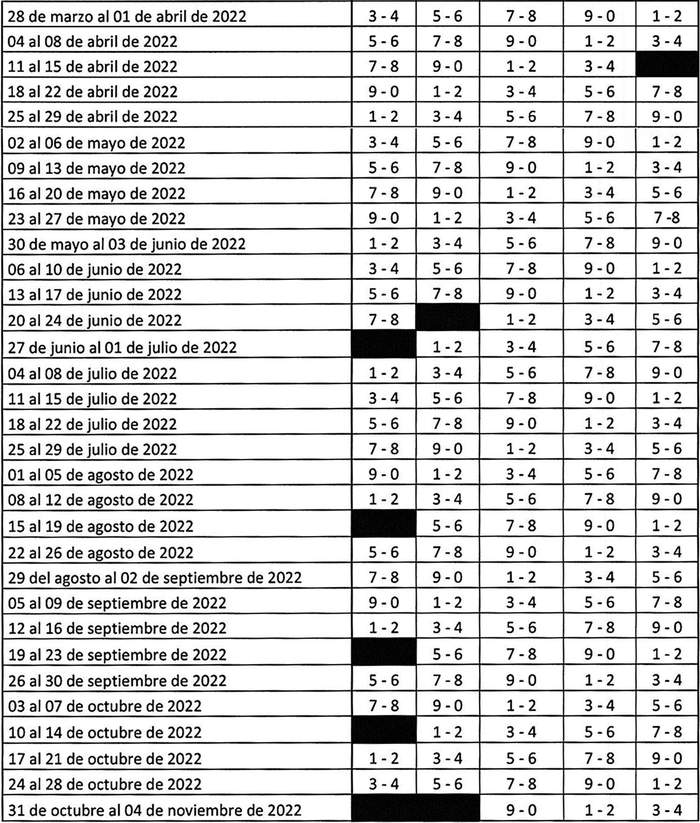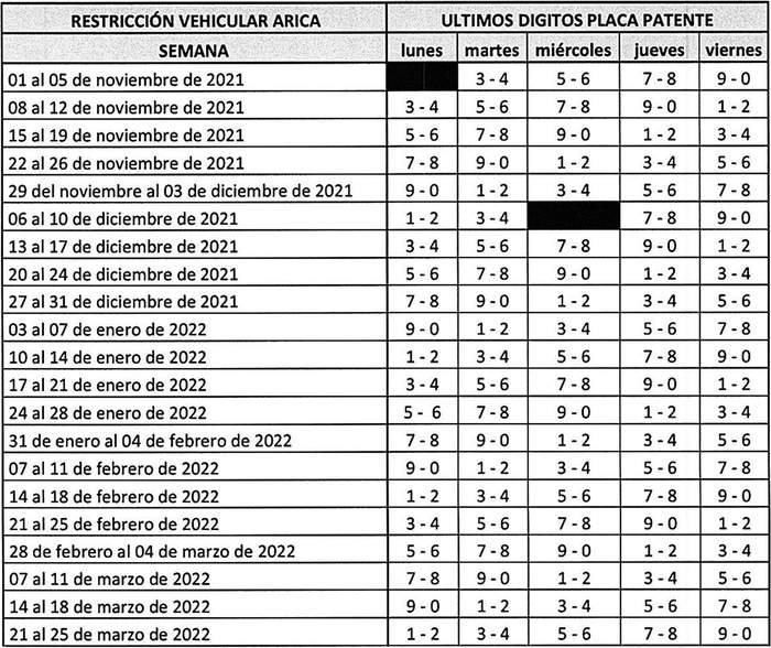 1. Prohíbase la circulación de los vehículos de transporte público urbano del tipo Taxi, que funcionan en la modalidad Colectivo Urbano, por las calles incluidas en la red vial básica de la ciudad de Arica, durante el período comprendido entre el 1 de noviembre de 2021 y el 4 de noviembre de 2022, de acuerdo al último dígito de su placa patente única, según el siguiente calendario: