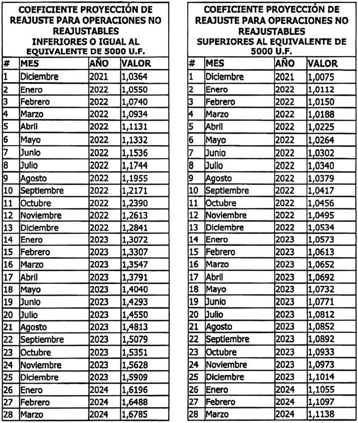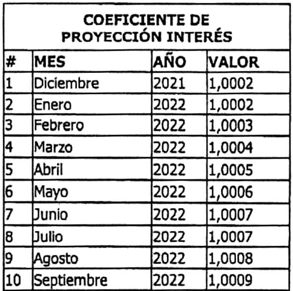 5°.- Estos coeficientes regirán para los efectos de calcular el monto adicional correspondiente a la proyección de reajuste y/o de interés de aquellas boletas bancarias de garantía cuya emisión se practique entre el 16 de noviembre de 2021 hasta el 15 de diciembre de 2021, inclusive.