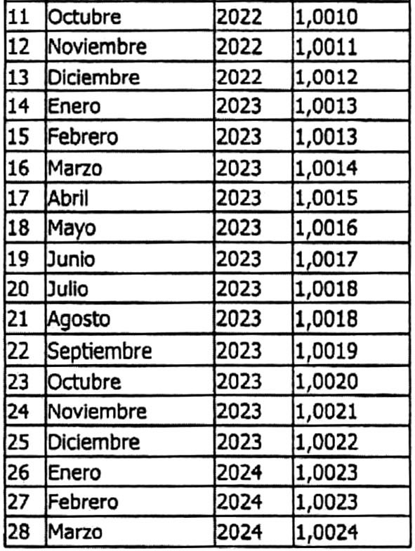 2°.- Fíjanse los coeficientes que a continuación se indican, según mes de vencimiento, para la proyección de intereses de las boletas bancarias de garantía a que se refiere el DS N° 40 (V. y U.), de 2004, solo respecto de los llamados y actuaciones efectuados conforme a sus disposiciones, las que continuarán aplicándose hasta su total extinción, de acuerdo con lo dispuesto en los incisos primero y segundo del artículo 75 del DS N° 1 (V. y U.), de 2011, que lo derogó; el DS N° 174 (V. y U.), de 2005; el DS N° 1 (V. y U.), de 2011; el DS N° 49 (V. y U.), de 2011; el DS N° 255 (V. y U.), de 2006; el DS N° 4 (V. y U.), de 2009; el DS N° 145 (V. y U.), de 2007, sólo respecto de los llamados y actuaciones efectuados conforme a sus disposiciones, las que continuarán aplicándose hasta su total extinción, de acuerdo a lo establecido en el artículo 2° transitorio del DS N° 3 (V. y U.), de 2010, que lo derogó; el DS N° 62 (V. y U.), de 1984; el DS N° 140 (V. y U.), de 1990, en sus artículos 16 y 19; el DS N° 135 (V. y U.), de 1986, en su artículo 9°; sea que dichas boletas de garantía estuvieren expresadas en Unidades de Fomento o en pesos, moneda nacional: