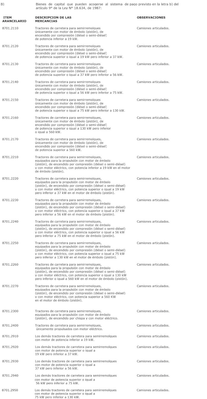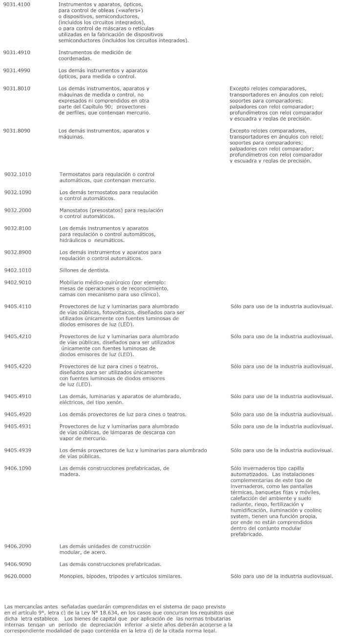 El decreto 394 Exento, Hacienda. publicado el 22.01.2024, modifica la lista de bienes de capital contenida en la presente norma en el sentido de incorporar el ítem arancelario 8108.9000, acompañado de la observación "solo cañería de titanio, utilizada en la fabricación de spool", a la mencionada lista; manteniéndose inalterado el referido decreto exento en todo lo no modificado por el presente acto administrativo.