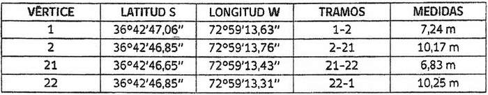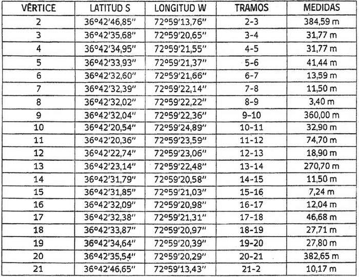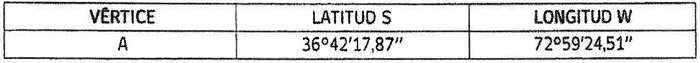 En cuanto a la porción de agua es la necesaria para mantener fondeada una boya para el amarre a proa de naves y embarcaciones sobre 100.000 TRG, cuyo vértice y coordenada es el siguiente: