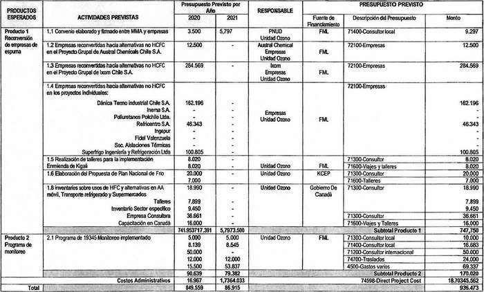 El ajuste presupuestario indicado en el párrafo 12 aumenta los recursos asociados al Producto 1 "Reconversión de empresas de espuma", quedando en un subtotal de US$2.056.236. El producto 2 "Programa de monitoreo" mantiene el total presupuestado inicialmente por US$202.774. Se adicionan los recursos restantes a los costos de administración de PNUD-Chile, quedando un subtotal de US$46.037. Por tanto, el presupuesto total del Proyecto, considerando los nuevos fondos, alcanza un total de US$2.305.047.