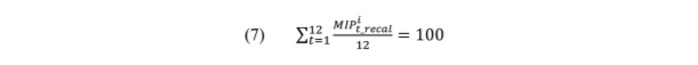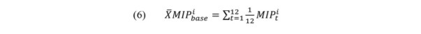 . Con esto se recalculan todos los MIP, ajustados por el promedio de los MIP para los meses considerados dentro del periodo base (XMIP i/base), de modo que el promedio de los doce meses de base sea igual a 100, es decir:
