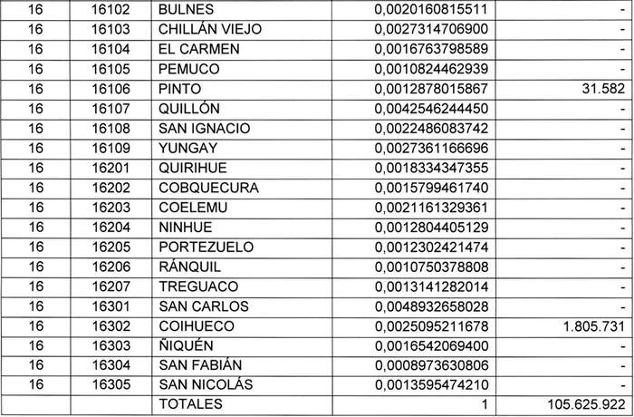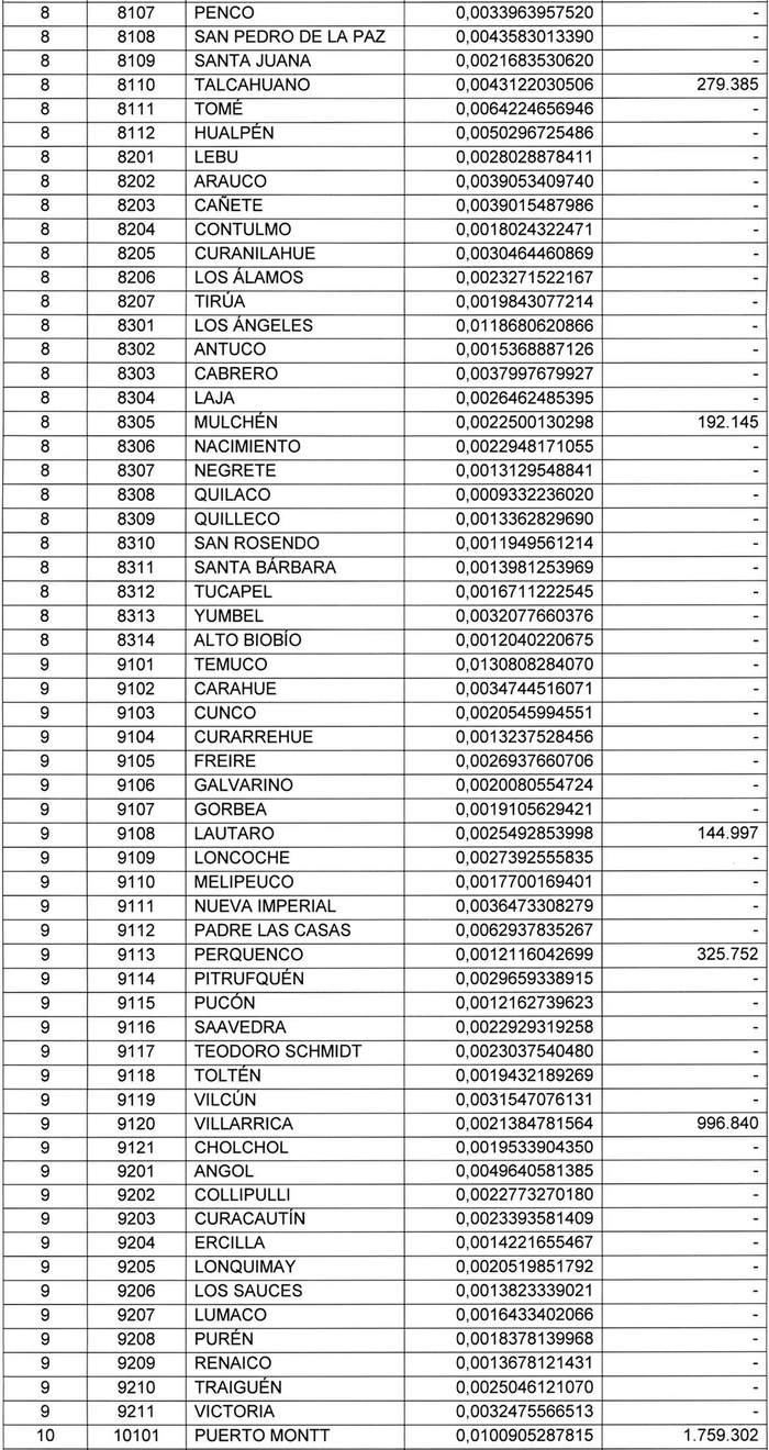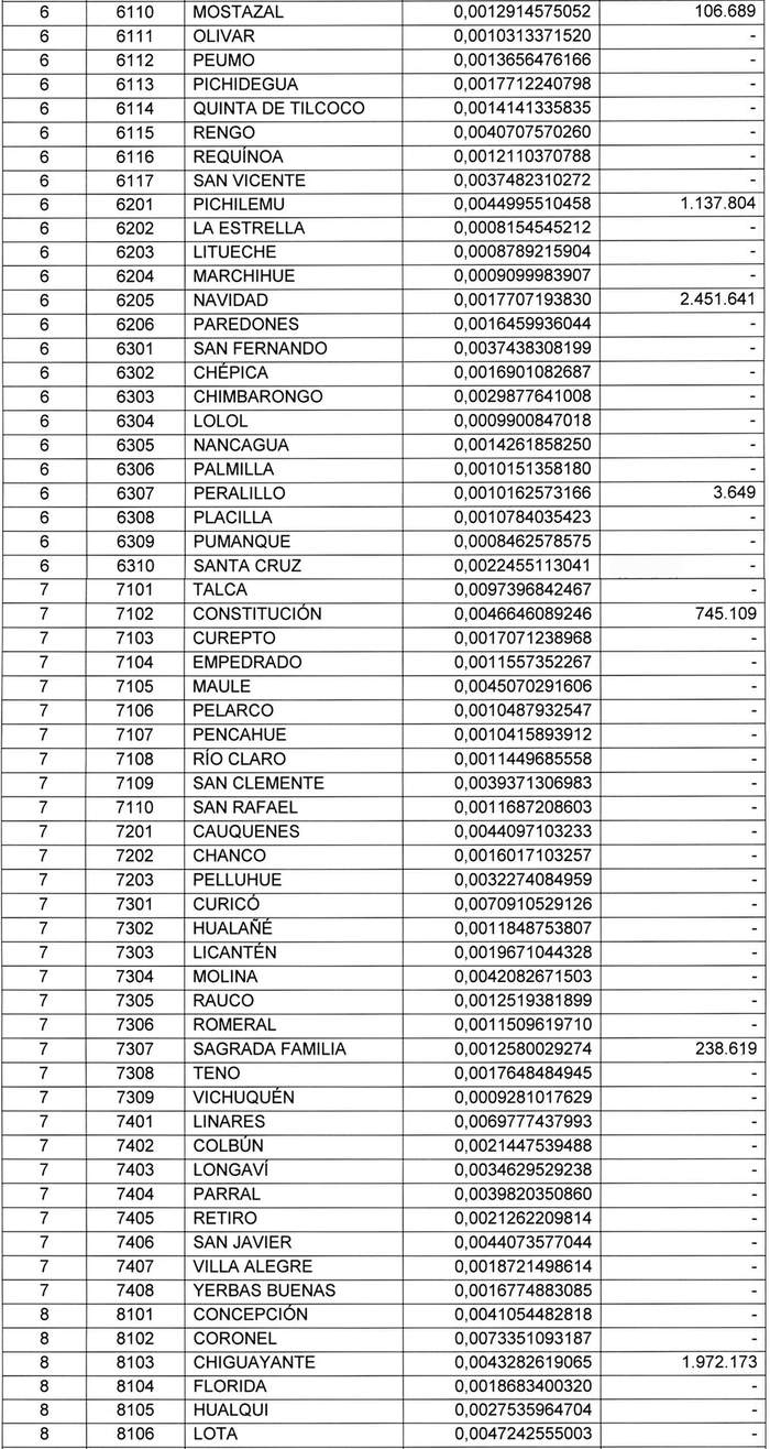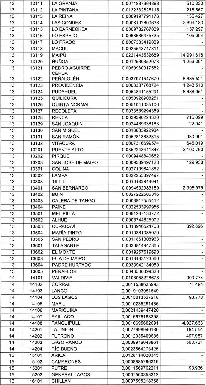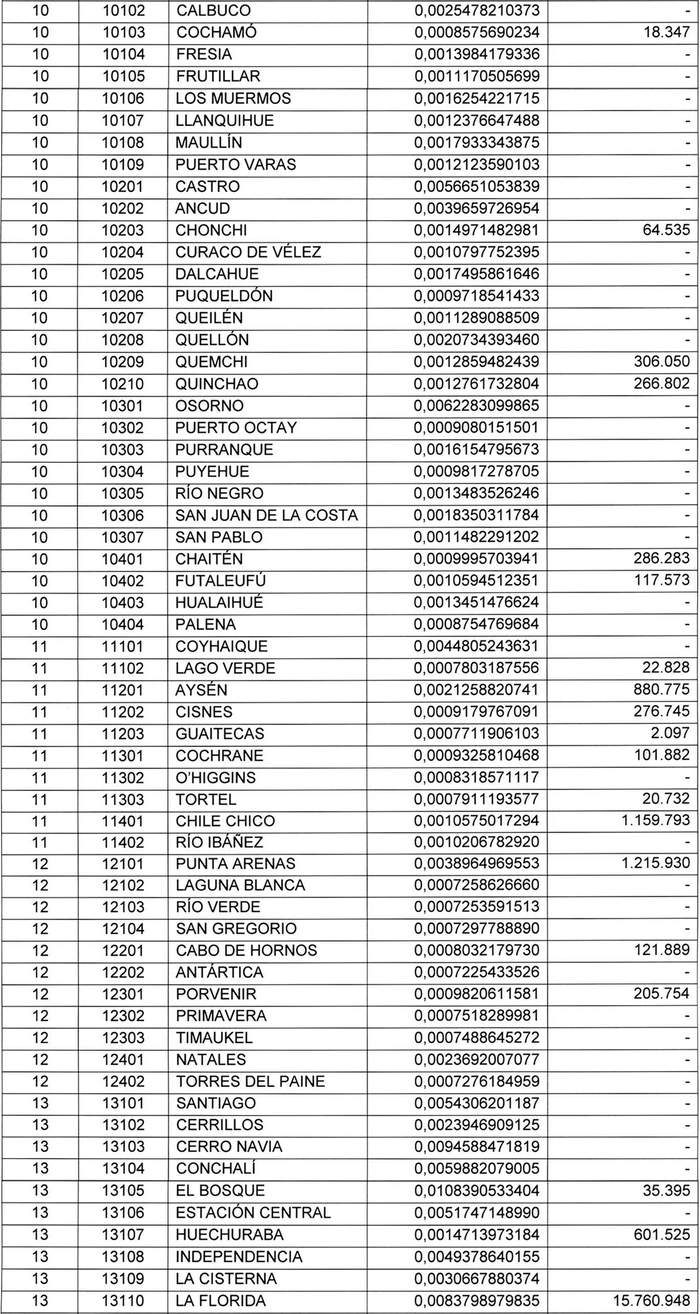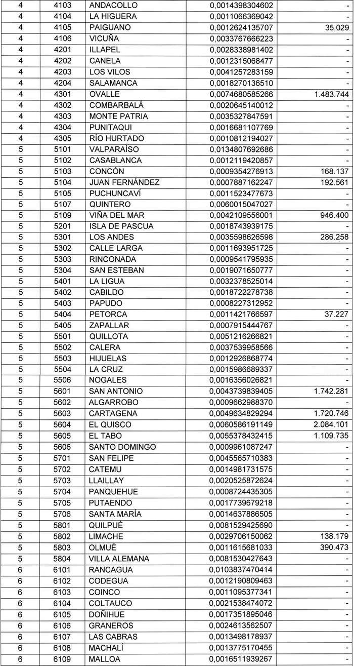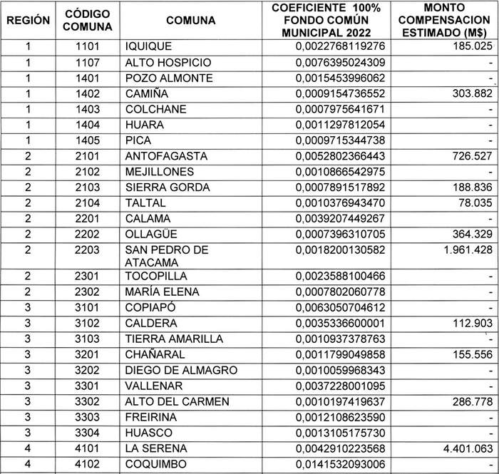 Artículo 4º.- Fíjase para las comunas del país, durante el periodo que corresponde entre el 1º de enero y el 31 de diciembre del año 2022, los coeficientes de distribución del Fondo Común Municipal que se indican y el monto total de M$105.625.922.- (Ciento cinco mil seiscientos veinticinco millones novecientos veintidós mil pesos) a percibir por las comunas que se indican por aplicación del mecanismo de estabilización:
