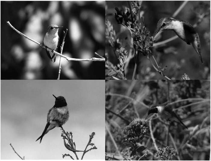 Figura 1. Picaflor de Arica, en las dos imágenes de arriba se aprecian dos individuos hembras, en la parte de abajo dos machos de la especie, se nota claramente el parche de la garganta y su dimorfismo sexual.