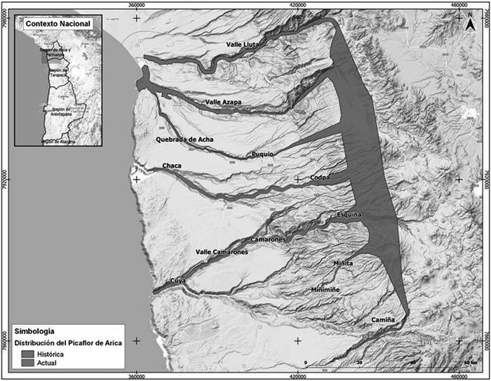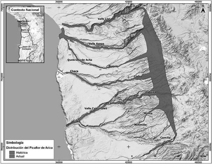 La distribución original del Picaflor de Arica abarcaba, por el norte, los valles del sur de Perú (Tacna) y, por el sur, aparentemente el valle de Camiña (del Hoyo et al. 1999). La gran mayoría de los registros de la especie durante la época reproductiva se han realizado bajo los 1000 msnm (Estades et al. 2007), con la excepción del valle de Codpa (2000 msnm). Las últimas evaluaciones realizadas en el sur de Perú sugieren que la especie estaría extinta en ese país (Cruz 2006).