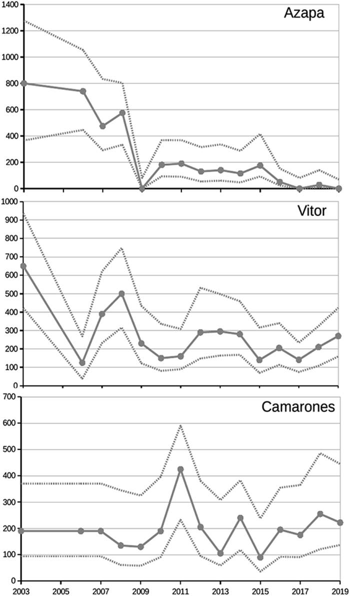 Figura 3. Tendencias poblacionales de E. yarrellii en los valles de Azapa, Vítor y Camarones entre 2003 y 2019. Los datos incluyen la media estimada más el intervalo de confianza al 90%. Fuente: AvesChile 2019.