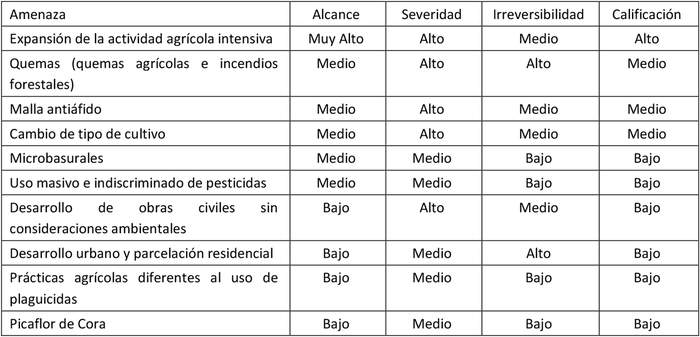 Cuadro 1. Valoración del nivel de impacto de las amenazas identificadas para el Picaflor de Arica1