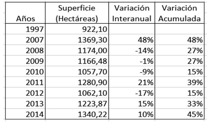 Como se observa en las estadísticas disponibles reportadas en el Cuadro 2, en la década 1997-2007 se presentó un crecimiento bastante considerable del uso del suelo para el cultivo de hortalizas. A partir del 2007 se presenta un comportamiento poco impredecible pero que se sostiene en el tiempo. Esto se explica por el uso de nuevas técnicas de cultivo que mejoran la productividad de las hortalizas mediante el uso de agroquímicos incluidos los pesticidas, el uso de estructuras del tipo invernadero y la intensificación en la explotación del suelo.