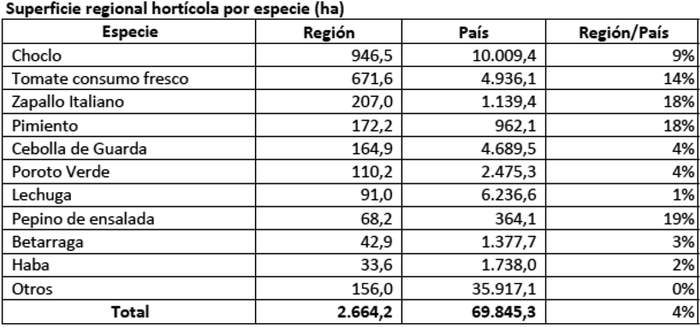 Los datos más actualizados que se disponen a la fecha están reportados en el Cuadro 3, con una superficie de más de 2.600 hectáreas de la región destinadas al cultivo de hortalizas y a esto hay que sumarle la superficie de frutales (datos no disponibles).