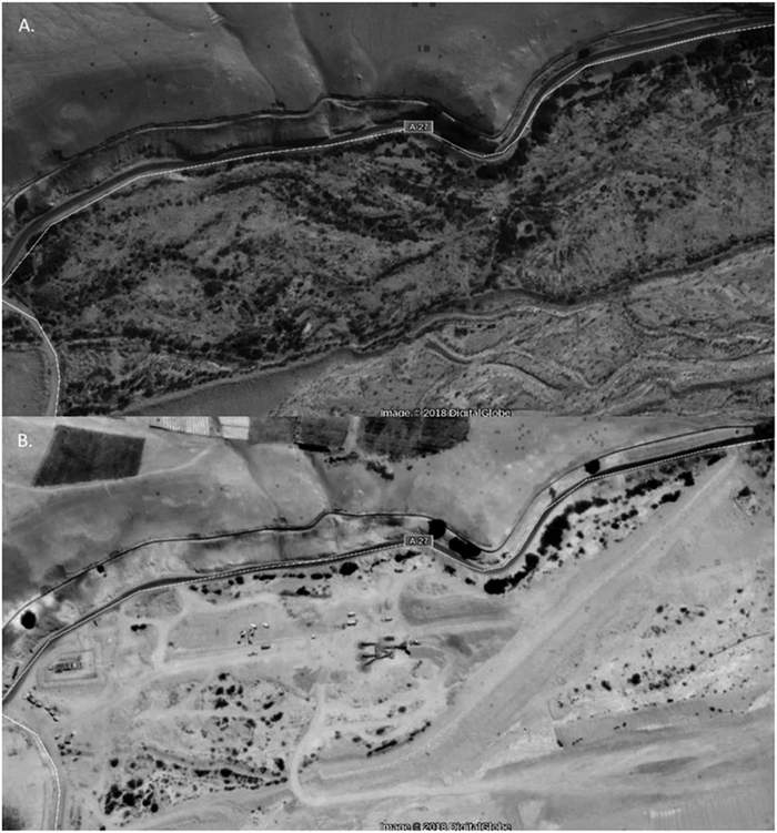 Figura 12. Modificaciones del sitio Pampa Gobernador por el impacto de obras desarrolladas por el MOP. Se aprecia claramente la diferencia de la parte A (año 2009) y la parte B año (2017). Elaboración propia.