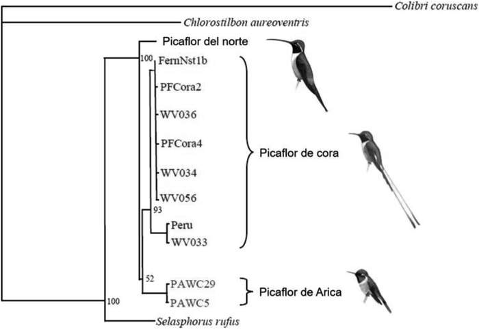 ob. pers.). Figura 13. Esquema de las relaciones filogenéticas entre las 3 especies de picaflores que cohabitan en los valles del norte de Chile. Fuente: van Dongen et al. 2