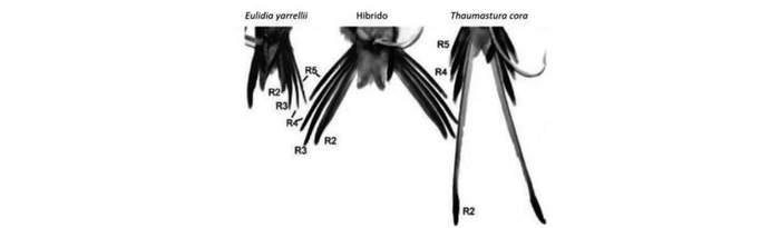 012. Figura 14. Fotografía con detalle de la coda del híbrido identificado con análisis genético, como se aprecia el tamaño de las rectrices de la cola está entremedio la de Picaflor de Arica y de Cora. Fuente: Clark et al. 2013.