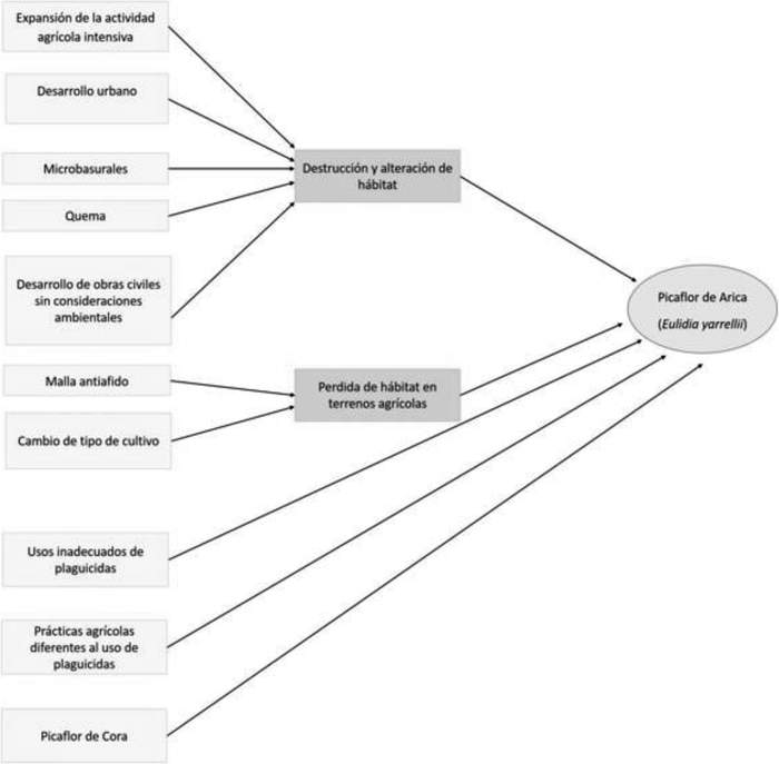 En el caso específico del Picaflor de Arica, gracias a los conocimientos desarrollados en los años de investigación y a los talleres de elaboración de este Plan realizados por el MMA, en conjunto con expertos de AvesChile y la Seremi Medio Ambiente de Arica y Parinacota y proyecto "Conservación de Especies Amenazadas" MMA-FAO-GEF, se han identificado 10 amenazas, las cuales fueron posteriormente clasificadas en función de su alcance, severidad e irreversibilidad, bajo los conceptos de estándares abiertos para la conservación por el programa Miradi (Cuadro 1).