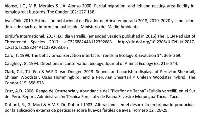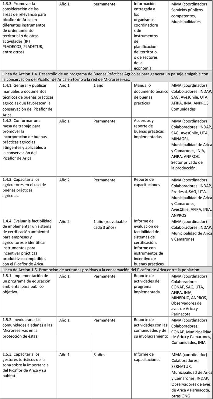 Este documento aborda el desafío de diseñar e implementar acciones para modificar la tendencia actual de la especie, a través de un plan integral de acciones, con la participación y coordinación de todos los actores, con sus respectivas responsabilidades y competencias. De este modo, el Plan de Recuperación, Conservación y Gestión del Picaflor de Arica, podrá constituir una adecuada directriz para coordinar y aunar los esfuerzos que permitan disminuir las amenazas y mejorar el estado de conservación de esta relevante especie.