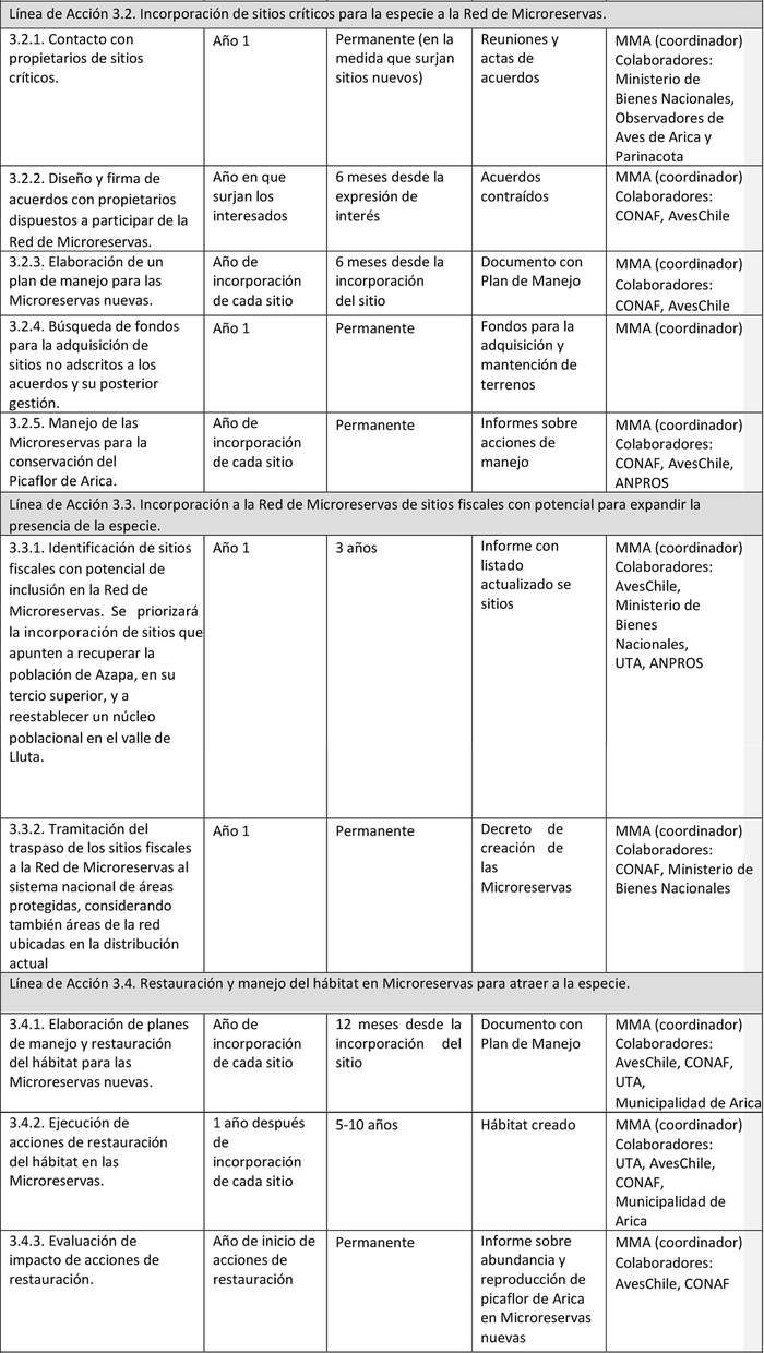 Para la etapa de implementación del Plan, es necesaria la participación de los distintos actores que tienen interés en la conservación de la especie y el uso del territorio en donde se distribuye el Picaflor de Arica, tanto del sector público como privado. En caso de los servicios públicos, se alude a las reparticiones de las regiones de Arica y Parinacota y de Tarapacá, como de nivel central en los casos que sea pertinente.