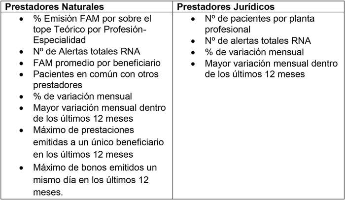 Es importante considerar que, por las diferencias entre las características de los convenios suscritos por el Fonasa con personas naturales o jurídicas y el comportamiento de los prestadores dadas estas condiciones, se generan también diferencias que deben ser evaluadas al momento de seleccionar variables que permitan el hallazgo de posibles incumplimientos normativos.