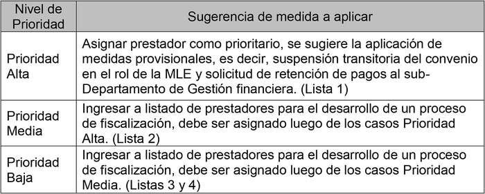 La priorización de los prestadores a fiscalizar se enfoca en aquellos que presentan los mayores niveles de cada variable analizada, es decir, los prestadores que resulten estar dentro de los más relevantes en todas estas variables tienen prioridad sobre aquellos que tienen valores menos relevantes en algunas de ellas.