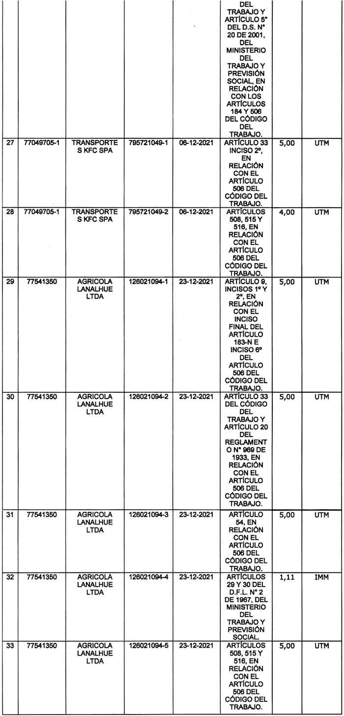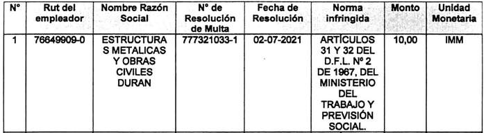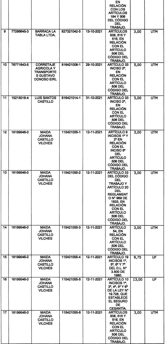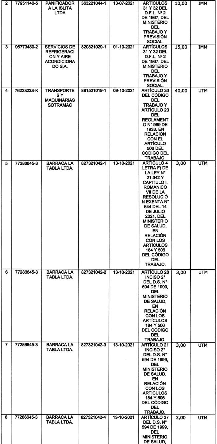 1) Notifíquese mediante publicación en el Diario Oficial, las resoluciones de multas descritas en el considerando Nº 1) de la presente resolución. Practicada la notificación, las resoluciones de multa adquirirán mérito ejecutivo una vez agotados los plazos para ejercer las acciones judiciales y administrativas en su contra (Arts. 503, 506 ter y 512 del Código del Trabajo).