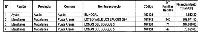 2. Apruébase la nómina de proyectos seleccionados con su respectivo financiamiento total, para el otorgamiento de subsidios del Programa Habitacional Fondo Solidario de Elección de Vivienda en la alternativa de postulación colectiva, para proyectos de Construcción en Nuevos Terrenos, en las Regiones de Aysén del General Carlos Ibáñez del Campo y de Magallanes y de la Antártica Chilena correspondiente al proceso de selección cuyo cierre de postulación se verificó el día 5 de mayo de 2022, del llamado efectuado por la resolución exenta N° 403 (V. y U.), de 2022: