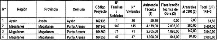 3. El monto del subsidio asignado de conformidad con el cuadro señalado en el Resuelvo 2. de esta resolución comprende los siguientes valores, en Unidades de Fomento, por concepto de Servicios de Asistencia Técnica, de Labores de Fiscalización Técnica de Obra y pago de Aranceles al Conservador de Bienes Raíces: