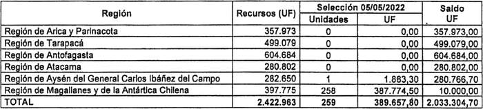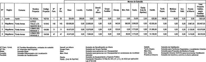 4. Los recursos comprometidos en el resuelvo 2. de la presente resolución, para los proyectos seleccionados en el llamado realizado mediante la resolución exenta N° 403 (V. y U.), de 2022, cuyo cierre de postulación se efectuó el día 5 de mayo de 2022, se señalan en el siguiente cuadro, incluyendo la suma total de familias beneficiadas y las Unidades de Fomento comprometidas, considerando los montos de subsidio de los proyectos, incluidos sus respectivos servicios de asistencia técnica y fiscalización técnica de obras para cada región del país: