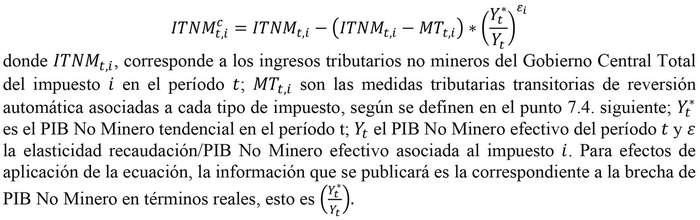 7.2. Para el cálculo de este Ajuste Cíclico, se utilizarán series de frecuencia anual, restándose a la partida de Ingresos Tributarios No Mineros la multiplicación entre dicha partida de ingresos menos una medida tributaria transitoria de reversión automática y el cociente que resulta entre el PIB No Minero Tendencial y el PIB No Minero efectivo para el año respectivo elevado a una elasticidad, es decir, un parámetro que rescata la sensibilidad de la recaudación tributaria al PIB No Minero, según la siguiente fórmula: