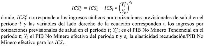 Para calcular el Ajuste Cíclico de los Ingresos por Cotizaciones Previsionales de Salud se utilizarán series de frecuencia anual y se aplica una ecuación similar a aquella utilizada para el Ajuste Cíclico de los ITNM, pero con un parámetro que rescata la sensibilidad de estos ingresos al PIB No Minero, según la fórmula y valores que se indican a continuación:
