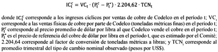 El Ajuste Cíclico de los Ingresos por Cobre Bruto (ICc) que se aplicará a los ingresos provenientes de los traspasos de la Corporación Nacional del Cobre (Codelco) al Fisco por las ventas de cobre, será equivalente a la diferencia entre las ventas físicas valoradas al precio efectivo y las ventas valoradas al precio de referencia, y se realizará corrigiendo estos valores por la brecha entre el precio de venta y el precio de referencia del metal, según la siguiente fórmula: