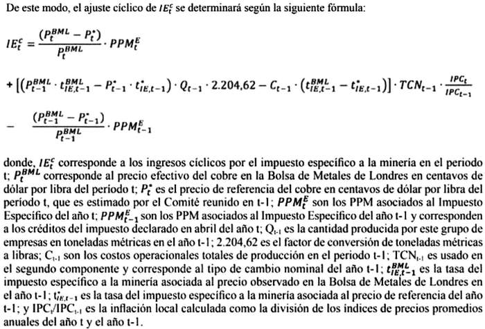 El Ajuste Cíclico de los Ingresos por el Impuesto Específico a la actividad minera o royalty minero (IEc) tendrá tres componentes: (i) ajuste a los Pagos Provisionales Mensuales (PPM) del impuesto del año en curso; (ii) ajuste al Impuesto Declarado; y (iii) ajuste a los Créditos (PPM del año anterior), todos ellos de las GMP. Tanto el Impuesto Declarado como los Créditos utilizarán los precios del año anterior para el cálculo de este ajuste cíclico.