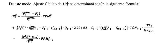 El Ajuste Cíclico de los Ingresos por el Impuesto a la Renta de Primera Categoría (IRc) consta de tres componentes: (i) ajuste a los ingresos por PPM del impuesto del año en curso, (ii) ajuste al Impuesto Declarado y (iii) ajuste a los ingresos PPM año anterior, todos ellos de las GMP. Tanto el Impuesto Declarado como los PPM año anterior utilizarán los precios del año anterior para el cálculo del Ajuste Cíclico.