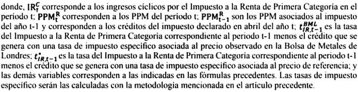 (ii) la diferencia entre las ventas valoradas al precio de referencia del cobre menos los costos operacionales, todo multiplicado por la diferencia entre la tasa de Impuesto Adicional menos la tasa de Impuesto específico valorada al precio de referencia del cobre y el impuesto de Primera Categoría, menos la tasa de Impuesto específico valorada al precio de referencia del cobre. Las tasas del Impuesto específico serán las calculadas con la metodología mencionada en los artículos precedentes.