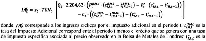 tasa del Impuesto Adicional correspondiente al periodo t menos el crédito que se genera con una tasa de impuesto específico asociada al precio de referencia; y la variable zt corresponde al porcentaje de remesas enviadas por las empresas al exterior. Esta última se obtendrá a partir de un promedio de los envíos de remesas al exterior, de acuerdo a una serie entregada trimestralmente por el Banco Central a la Dirección de Presupuestos.