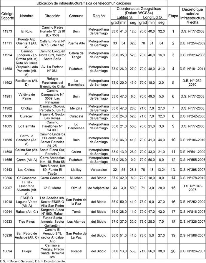 e) El decreto supremo N° 99, de 2012, del Ministerio de Transportes y Telecomunicaciones, que fija el reglamento que establece los requisitos para obtener, instalar, operar y explotar concesiones de servicios intermedios de telecomunicaciones que únicamente provean infraestructura física para telecomunicaciones.