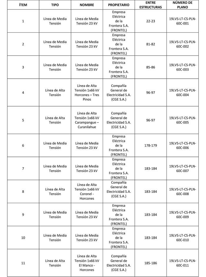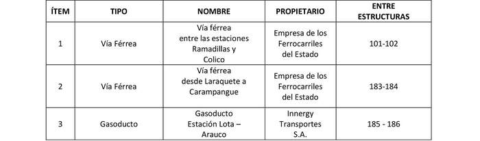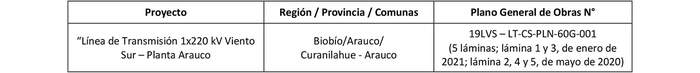En su recorrido, la "Línea de Transmisión 1x220 kV Viento Sur - Planta Arauco" afectará las líneas eléctricas, obras e instalaciones existentes que se indican a continuación:
