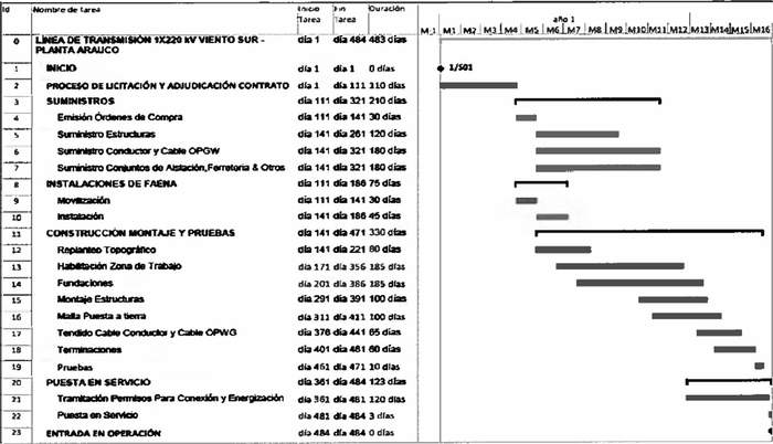 Artículo 15°.- Si por cualquiera circunstancia, alguno de los tramos en que se ha dividido el proyecto de transmisión "Línea de Transmisión 1x220 kV Viento Sur - Planta Arauco" no pudiere ejecutarse, el retiro de las instalaciones que ocupen bienes nacionales de uso público, terrenos fiscales o particulares, deberá hacerse dentro del plazo y en las condiciones que fije la Superintendencia de Electricidad y Combustibles, de conformidad a la normativa vigente.
