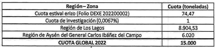 Por resolución exenta N° 1.557, de 2 de agosto de 2022, modifícase el Resuelvo 1.- de la resolución exenta N° 675, de 2022, ambas de esta Subsecretaría, que estableció la distribución de la cuota del recurso Erizo en las regiones de Los Lagos y de Aysén del General Carlos Ibáñez del Campo para el año 2022, en el sentido de reemplazar la tabla allí contenida, por la que se indica a continuación: